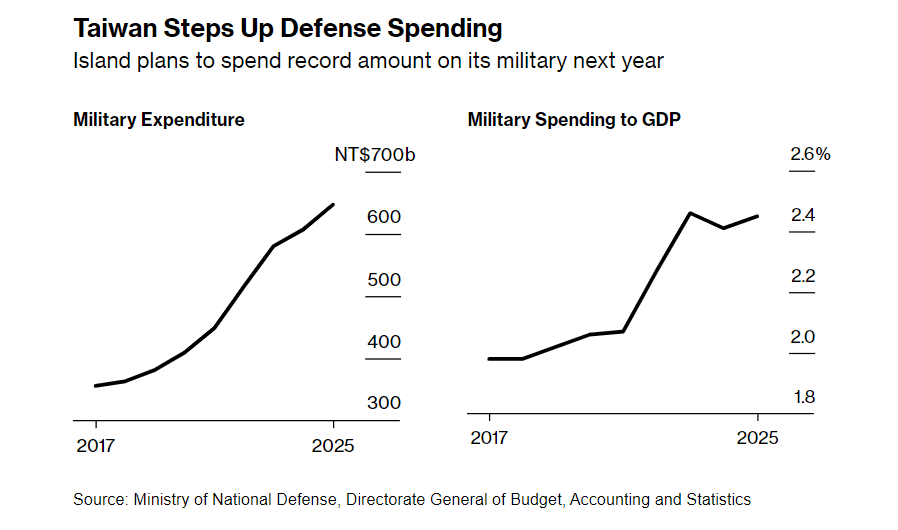Taiwán planea gastar una cantidad récord en defensa el próximo año, incrementando su presupuesto militar por octavo año consecutivo en un esfuerzo por disuadir a una China cada vez más agresiva.