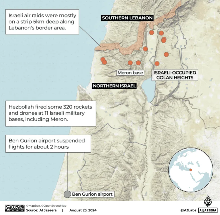 En la madrugada de este domingo, el grupo Hezbolá lanzó cientos de cohetes y aviones no tripulados contra Israel en represalia por el asesinato del alto comandante Fuad Shukr el mes pasado. Hezbolá afirmó que había lanzado drones y más de 320 cohetes Katyusha contra Israel, alcanzando 11 objetivos militares.