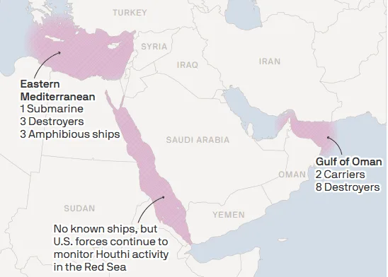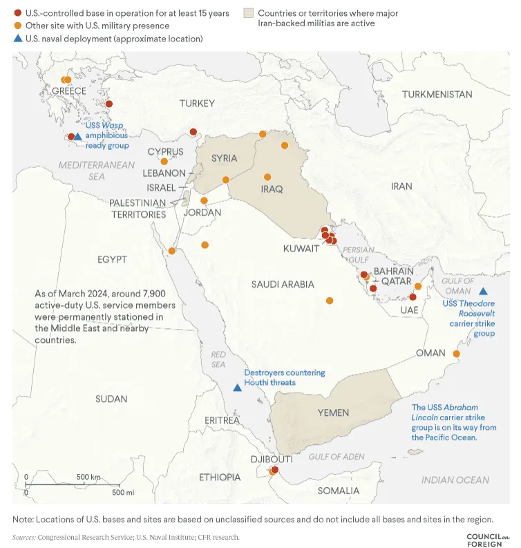 Desde el estallido de la guerra en octubre de 2023 entre Hamás e Israel, la presencia militar de Estados Unidos en Medio Oriente ha aumentado. Su existencia en la región se mantiene con miles de soldados desplegados en más de 12 países y numerosos buques en las aguas que rodean Medio Oriente.