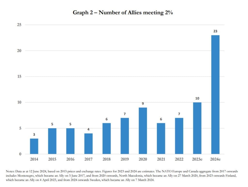 Durante los últimos años, y teniendo en cuenta la guerra de Ucrania, algunos de los miembros de la OTAN aumentaron el gasto en defensa. Por ejemplo, este año, por primera vez, la mayoría de los países de la OTAN han alcanzado el umbral del 2%, una tendencia muy marcada a diferencia del año 2023.