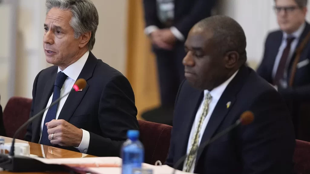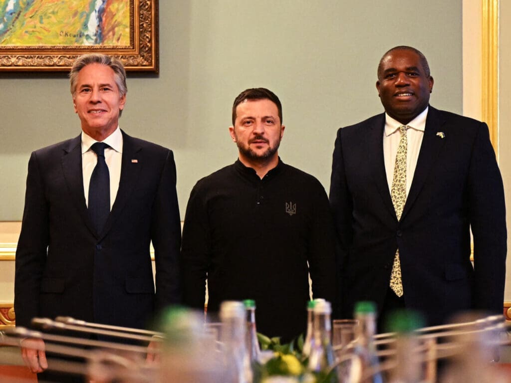 El secretario de Estado de EE. UU., Antony Blinken (izquierda) y el ministro de Relaciones Exteriores británico, David Lammy (derecha), junto al presidente ucraniano, Volodimir Zelenski (centro). France24