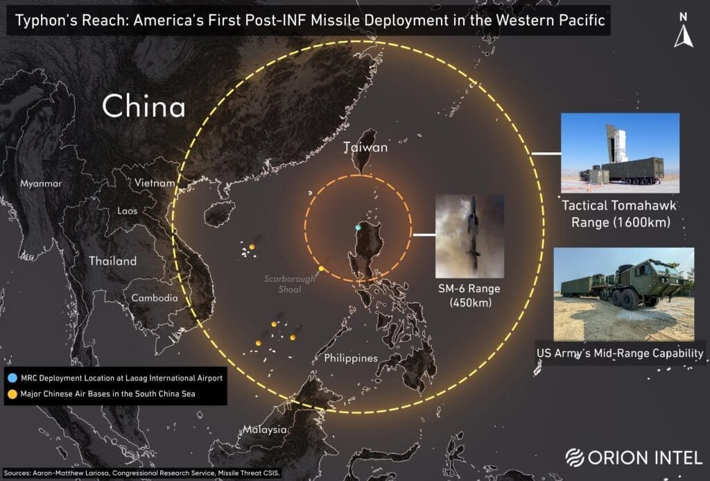 A pesar de las quejas expresadas por China, EE.UU. confirmó que mantendrá los misiles de alcance medio desplegados en Filipinas con el objetivo de reforzar la disuasión en la región. En abril, el ejército estadounidense transportó el sistema de misiles Typhon, una plataforma terrestre que puede lanzar el misil Standard Missile-6 y el misil de ataque terrestre Tomahawk, al norte de Filipinas como parte de ejercicios militares conjuntos con tropas filipinas, y para evaluar su capacidad de despliegue aéreo con la Fuerza Aérea estadounidense.