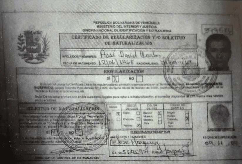 Cuando el gobierno entregó imágenes a la Fiscalía de Buenos Aires sobre el terrorista, afirmaron: “esas fotos serían de 2004, cuando la dictadura venezolana le otorgó un documento bajo el nombre de David Assi. En esos trámites migratorios aparece registrado como nacido el 2/6/1968 y un documento número 26458379. La documentación lleva la firma de una funcionaria venezolana, María Guillen”.