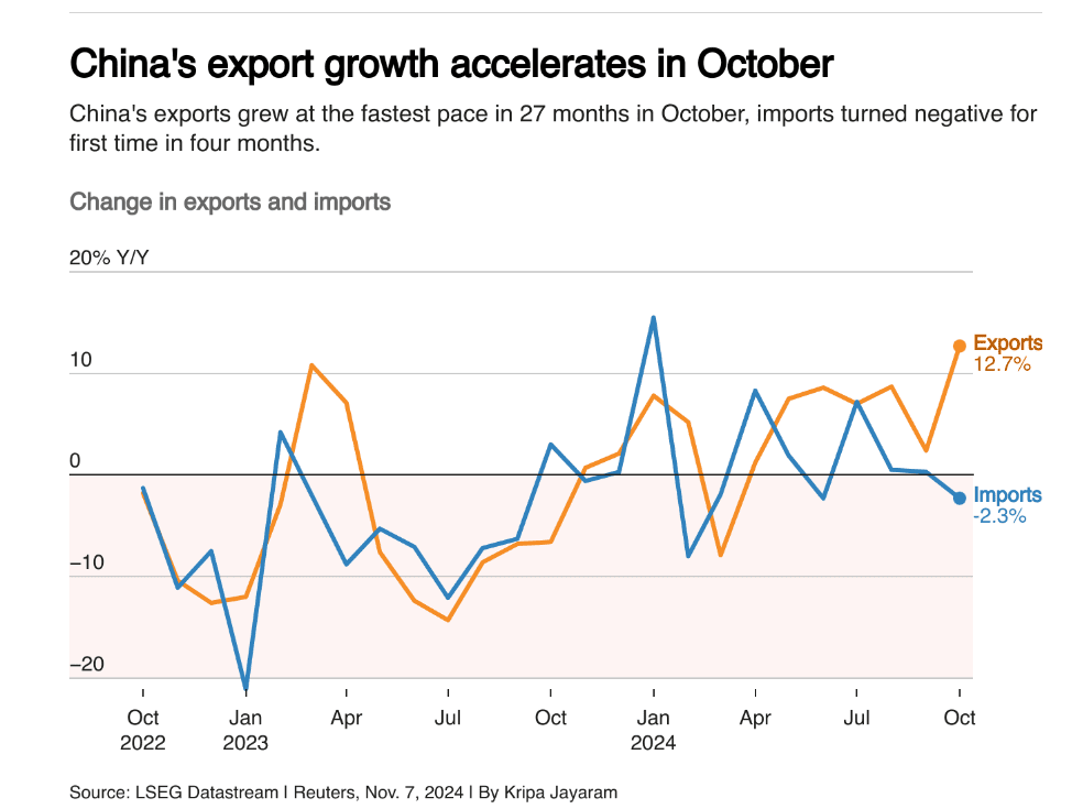 En octubre, las exportaciones de China a Estados Unidos aumentaron un 8,1% interanual, mientras que las exportaciones hacia Europa crecieron un 12,7%. Zichun Huang, economista en Capital Economics, señaló que el regreso de Trump podría generar un aumento temporal en las exportaciones chinas, ya que los importadores estadounidenses adelantan sus compras para evitar aranceles.