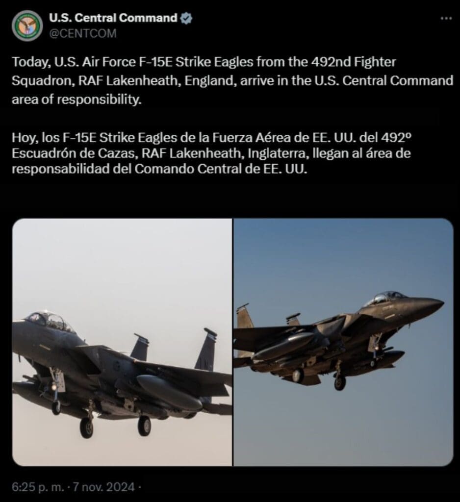 El pasado jueves, arribaron a Medio Oriente los aviones caza F-15E de Estados Unidos con el objetivo de reforzar la presencia occidental en la región. Según informó el ejército estadounidense, los F-15E se desplegaron desde el 492º Escuadrón de Caza de la Fuerza Aérea de Inglaterra hacia la zona de responsabilidad del Mando Central de EE.UU. (CENTCOM).