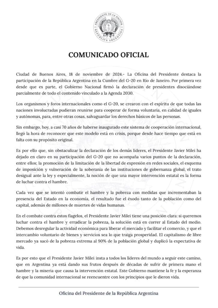 La participación de Argentina en la reciente Cumbre del G20 en Río de Janeiro marcó un punto de inflexión en la posición del país frente a las políticas impulsadas por este foro internacional. Por primera vez desde su adhesión, el gobierno argentino, bajo la conducción del presidente Javier Milei, decidió firmar la declaración final de la cumbre con reservas específicas, rechazando aquellas disposiciones relacionadas con la Agenda 2030 de la ONU. El comunicado oficial, difundido por la Oficina del presidente, detalla que Argentina reafirma su compromiso con el diálogo internacional, pero sin aceptar puntos que considere incompatibles con los intereses y valores nacionales.