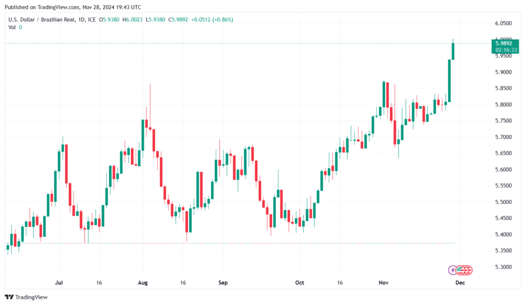 La moneda cayó hasta un 1,1% al inicio de la jornada del jueves, situándose en 5,99 por dólar, por debajo del anterior mínimo intradiario de 5,97 por dólar registrado en mayo de 2020 durante la pandemia de Covid-19. En lo que va del año, el real brasileño acumula una caída del 19%, posicionándose como el peor desempeño entre las divisas de mercados emergentes.