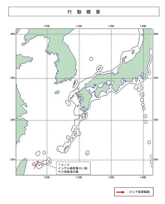 El pasado martes, Japón anunció que buques y un submarino de la Armada de Rusia fueron detectados navegando en aguas próximas a Taiwán, entre la isla Yonaguni e Iriomote. Según las Fuerzas de Autodefensa del país nipón, se avistaron buques de la clase Ingul y un submarino clase Kilo en dirección al Mar de China Oriental.