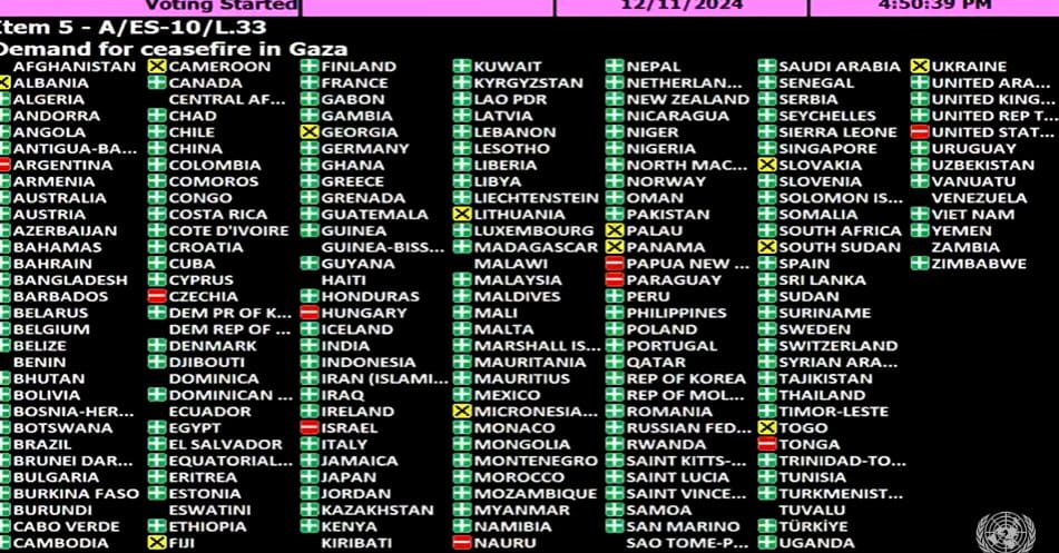 Argentina integró un reducido grupo de nueve naciones que votaron en contra de ambas resoluciones, junto a República Checa, Hungría, Israel, Nauru, Papúa Nueva Guinea, Paraguay, Estados Unidos y Tonga, alejándose de la posición mayoritaria de la comunidad internacional y de la tradicional política exterior argentina en el conflicto palestino-israelí.