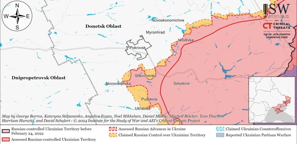 La ofensiva de Moscú en dirección a Pokrovsk crecen día a día. Según expertos, Rusia está intentando rodear la ciudad por el oeste, habiendo ya capturado la ciudad de Selidove y avanzando hacia las afueras occidentales. Se cree que los objetivos son más amplios, pudiendo llegar a capturar Kostyantynivka y gran parte del territorio circundante y cortar la conexión entre Pokrovsk y Pavlohrad, en Dnipropetrovsk.