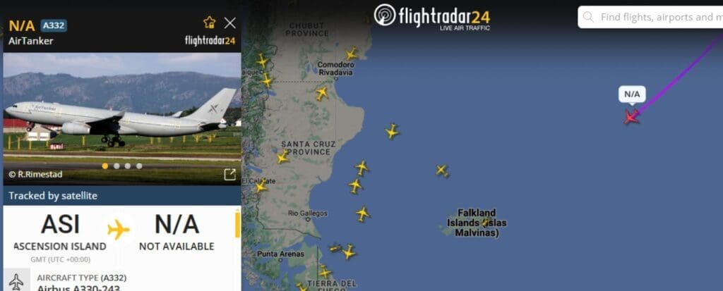 Captura de pantalla del registro satelital de vuelos documentados por flightradar24, este lunes 13, de la llega del Airbus A330 a Malvinas, con escala en Ascensión. Créditos: Agenda Malvinas