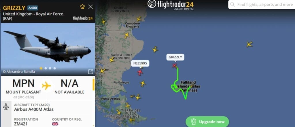 Este lunes por la tarde, aviones militares del Reino y vuelos comerciales de la Argentina fueron registrados por diversas aplicaciones mientras volaban en proximidades de las Malvinas, destacando la relevancia de como ambos países utilizan el espacio aéreo en torno a las islas. Reportado por el portal de noticias Agenda Malvinas, uno de los protagonistas británicos habría sido un Airbus 400M Atlas que despegó de las Islas Malvinas.