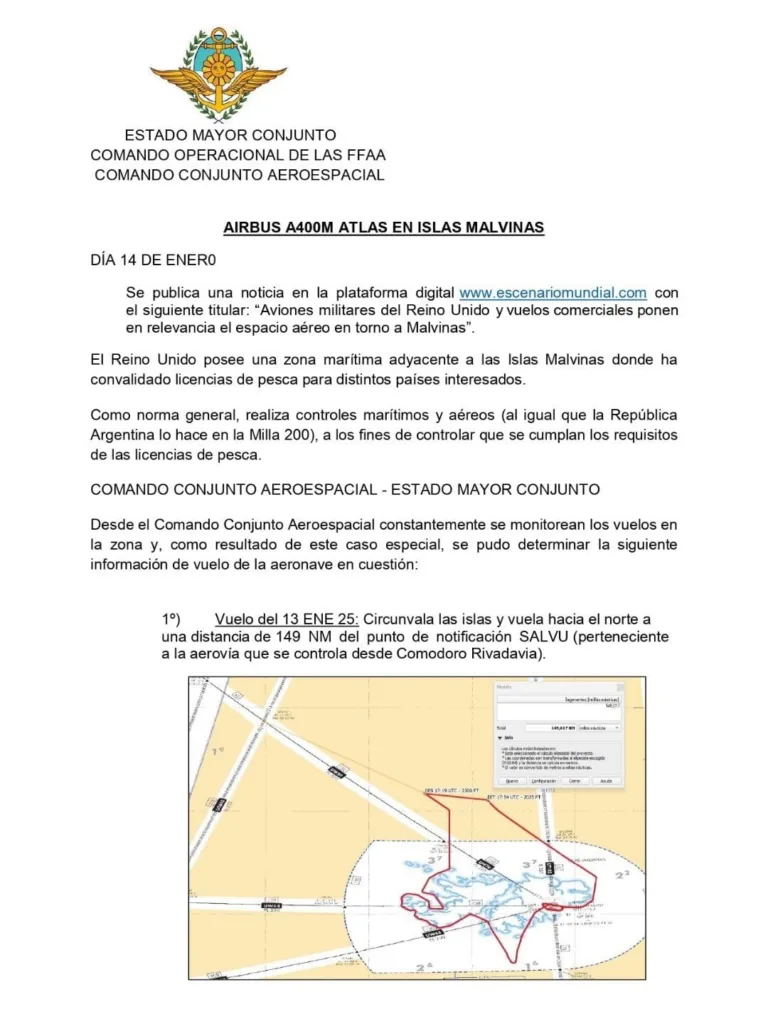 El Estado Mayor Conjunto (EMCO) de las Fuerzas Armadas de Argentina emitió recientemente un informe para aclarar cuestiones relacionadas con los acontecimientos ocurridos la semana pasada, donde un avión del Reino Unido en las Islas Malvinas se aproximó a vuelos comerciales argentinos. El 14 de enero se detectó, a través de aplicaciones de seguimiento, que un avión Airbus 400M Atlas británico despegó de las Islas Malvinas y tuvo aproximaciones cercanas a vuelos comerciales argentinos, donde el Airbus apagó el transpondedor o comenzó a volar a menor altitud, sin dejar registrado sus siguientes movimientos.