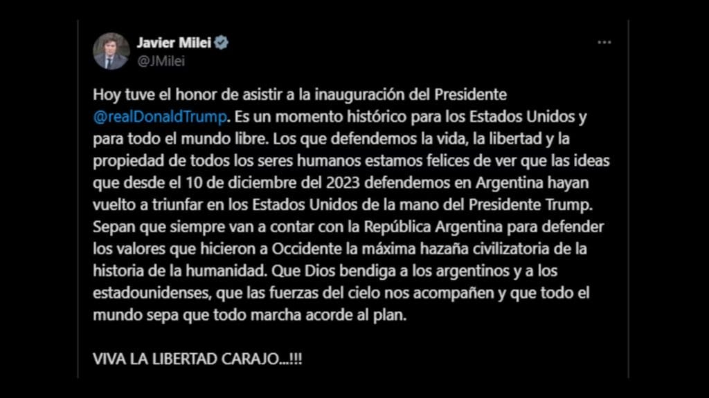 En torno a la ceremonia, puntualizó en que se trató de un “momento histórico para todo el mundo libre”, a la cual fue invitado por el propio Trump. Horas después de la ceremonia, Milei publicó en X que tuvo el honor de asistir a la inauguración y comparó el triunfo del estadounidense con el propio.  “Los que defendemos la vida, la libertad y la propiedad de todos los seres humanos estamos felices de ver que las ideas que desde el 10 de diciembre del 2023 defendemos en Argentina hayan vuelto a triunfar en los Estados Unidos de la mano del presidente Trump”, destacó.