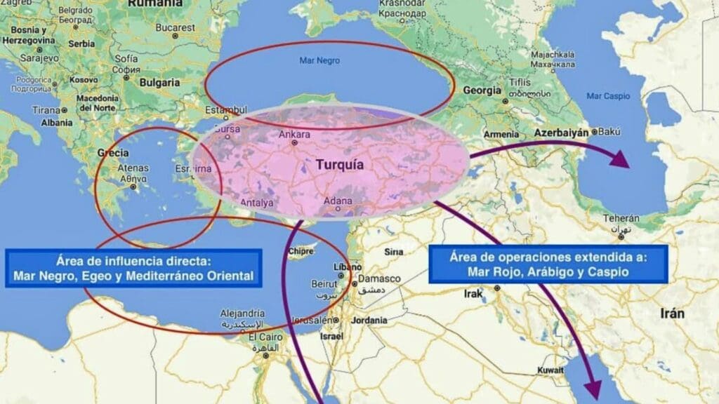 En el centro de la doctrina de Patria Azul se encuentra la aspiración turca de controlar aproximadamente 462 mil kilómetros cuadrados de espacio marítimo en el Mediterráneo, el Egeo y el Mar Negro. Estas áreas, ricas en recursos energéticos, incluyen territorios marítimos disputados con Grecia y Chipre. Bajo el marco de esta doctrina, Ankara busca garantizar su independencia energética y consolidarse como potencia regional mediante la exploración de hidrocarburos y la proyección militar.