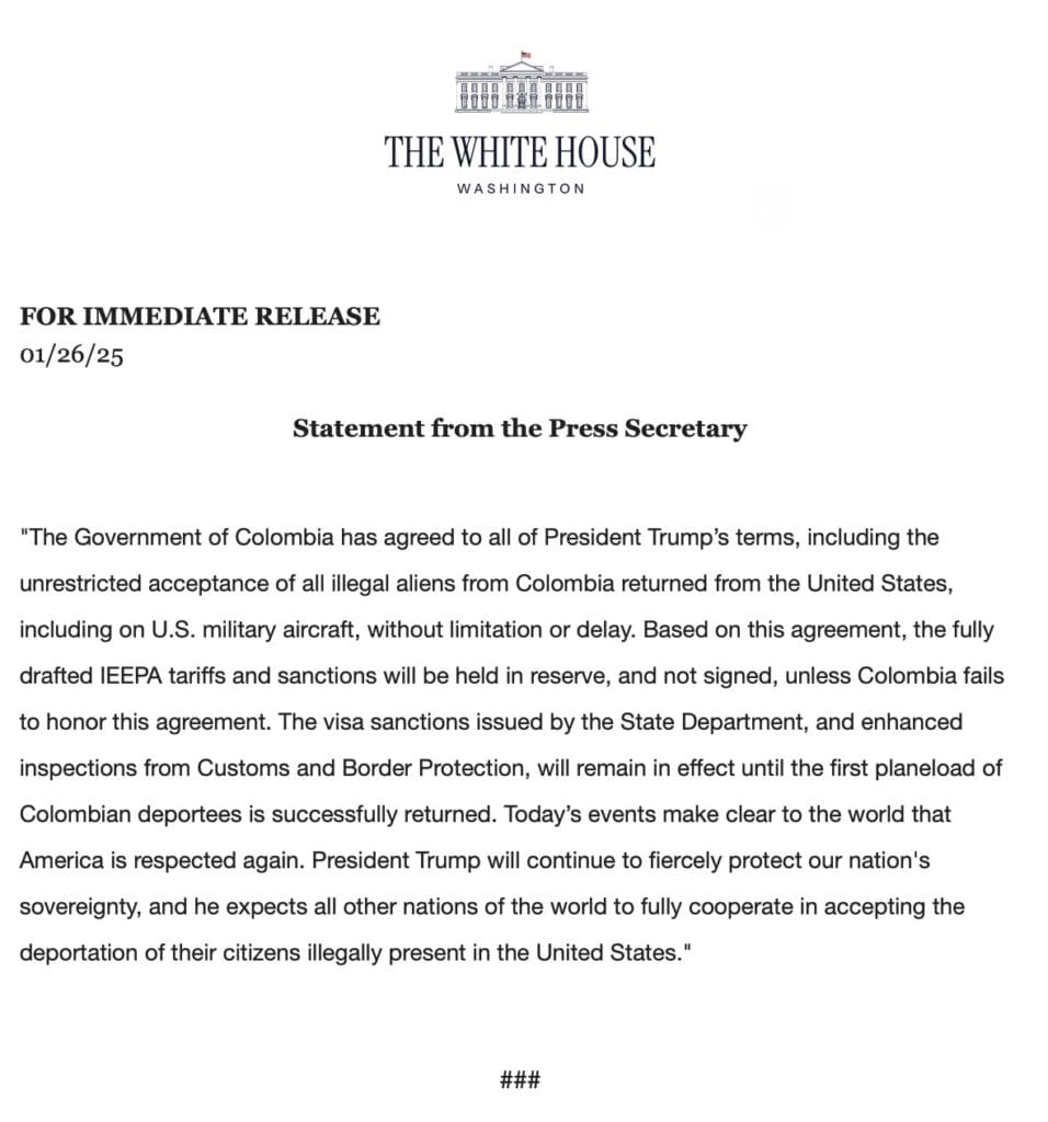 Luego de estos acontecimientos y de largos comunicados rechazando las medidas del otro, la Casa Blanca declaró que se había llegado a un acuerdo con Colombia. “El gobierno de Colombia ha acordado todas las condiciones del presidente Trump, incluida la aceptación sin restricciones de todos los inmigrantes ilegales de Colombia retornados desde Estados Unidos, incluidos los que lleguen en aviones militares, sin limitaciones ni dilación”, expresó.