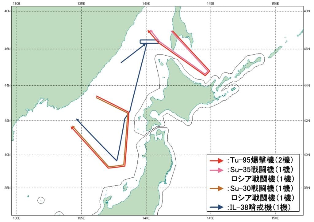 Además, se confirmó que un avión de patrulla ruso (IL-38) estaba volando sobre el Mar de Japón durante estas maniobras. Y como una respuesta inmediata a estas actividades, el Comando de Defensa Aérea del Norte de Japón, y otras fuerzas, desplegaron aviones de combate para monitorear el espacio aéreo nacional.