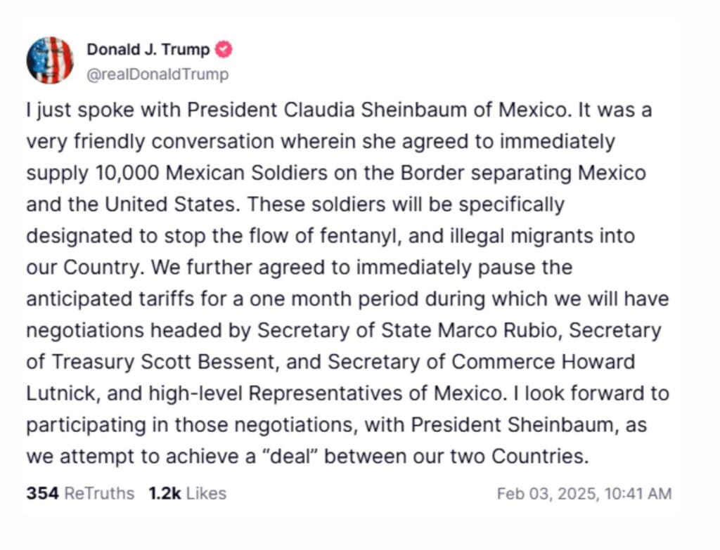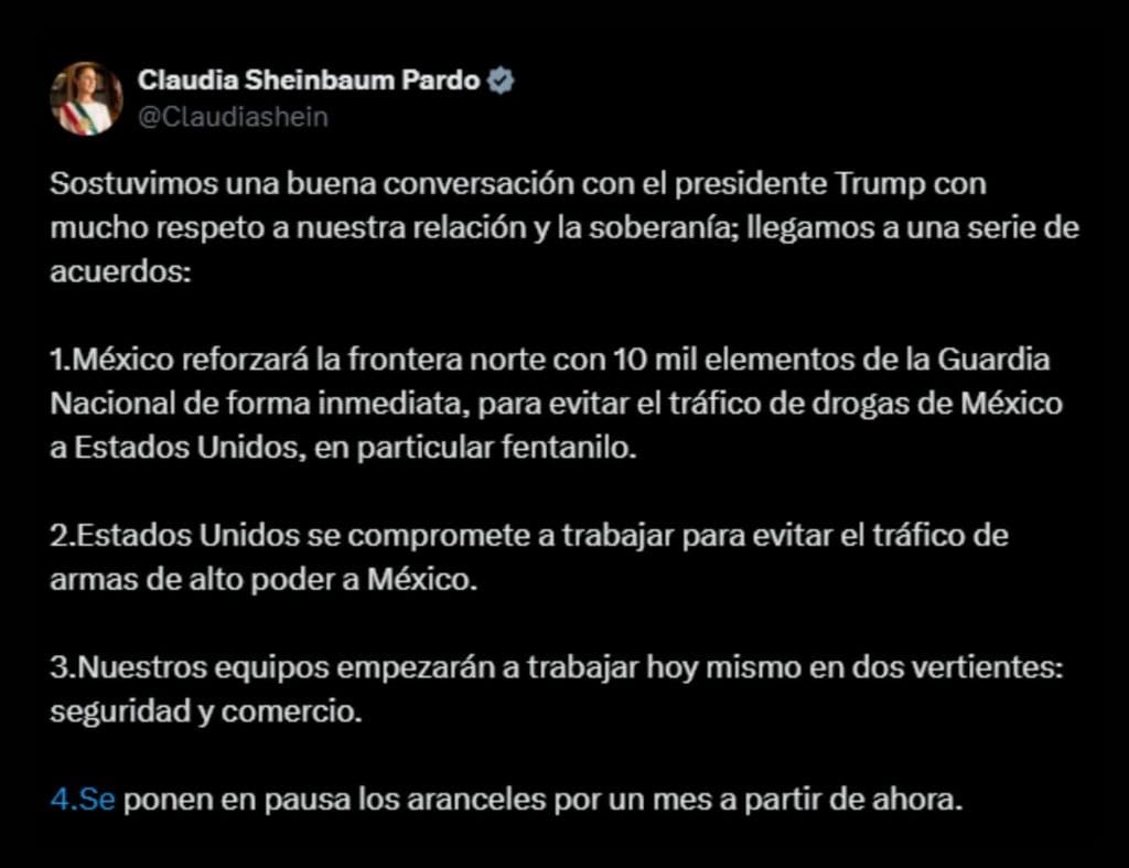 La mandataria afirmó en X la serie de acuerdos alcanzados entre ambas partes. Además de la pausa de aranceles, anunció el refuerzo de la frontera norte de México con 10 mil elementos de la Guardia Nacional. En segundo lugar, el compromiso de Estados Unidos para evitar el tráfico de armas de alto poder a México. Por último, el trabajo conjunto en materia de comercio y seguridad.