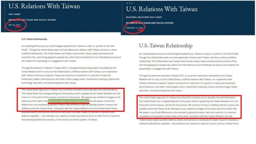 La semana pasada, la web del Departamento de Estado eliminó una parte del sitio en la que se declaraba que Washington no apoya la independencia de Taiwán. Además de suprimir esta frase, la hoja informativa agregó que Estados Unidos apoyará la pertenencia de Taiwán a organizaciones internacionales “cuando proceda”.
