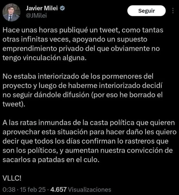 La publicación, que incluía un enlace para comprar la moneda, provocó un repentino aumento de su precio; sin embargo, en pocas horas Milei eliminó el mensaje y el valor de la criptomoneda se desplomó, dejando a muchos inversores con pérdidas considerables.