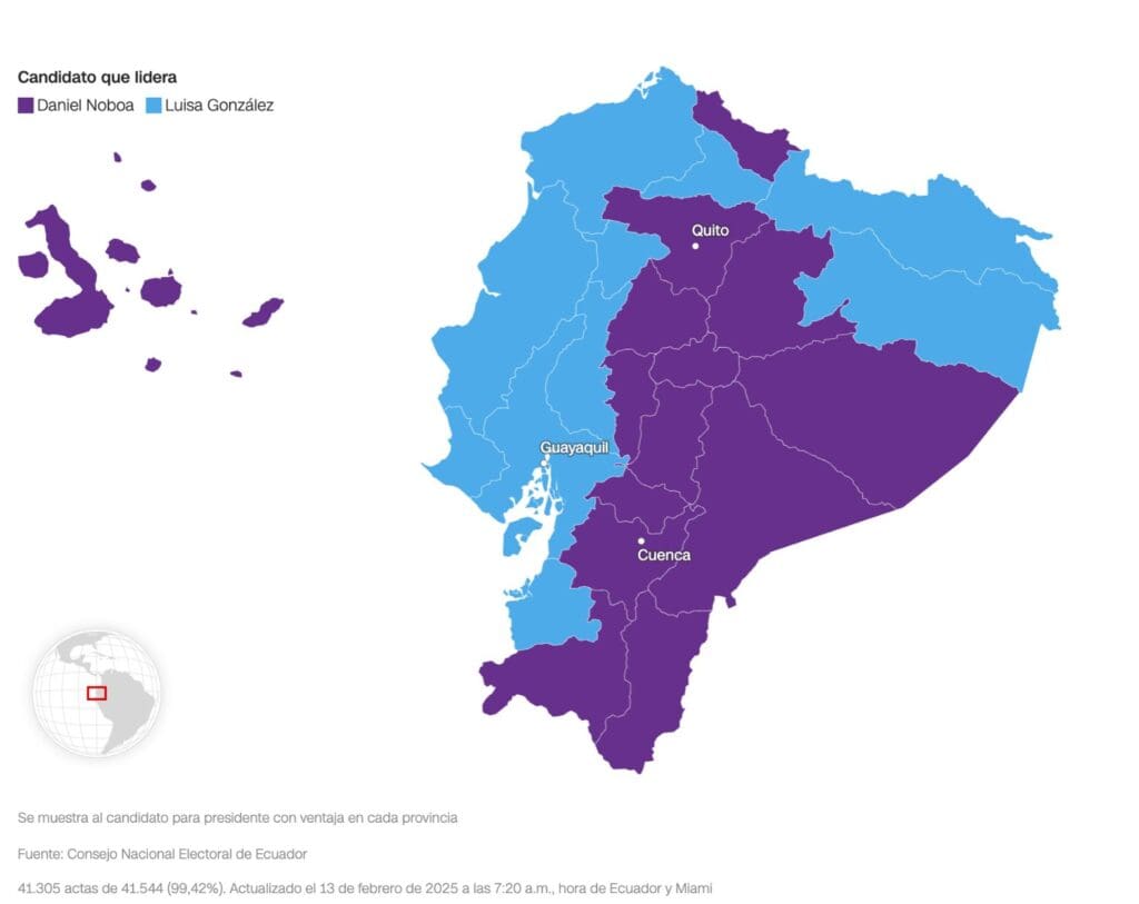 Al profundizar en el escrutinio, en los territorios que mayor porcentaje de votos sacó Noboa en 2023, y los comparamos a los del pasado domingo 9 de febrero, hay brechas importantes. Ambato, por ejemplo, en 2023 Noboa recibió el 75% de los votos en la segunda vuelta, y en la primera de 2025, sacó apenas el 62%. Lo mismo ocurrió en Loja, un eslabón fuerte de Noboa, donde cosechó el 77% en 2023, y el domingo pasado el 65%.