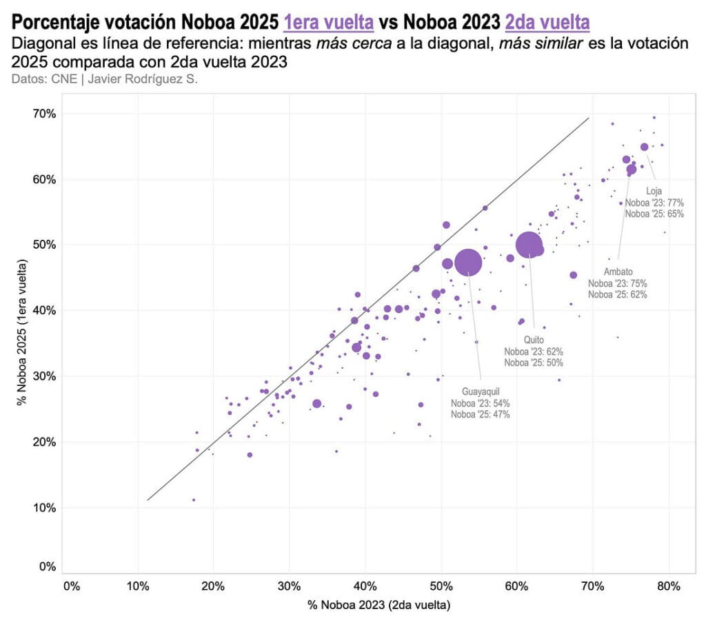 “Si Noboa ya absorbió los votos que en segunda vuelta le hubieran llegado dadas las características de esta elección, entonces el termómetro más adecuado de su desempeño electoral en la primera vuelta del domingo es la comparación de la primera vuelta de 2025 con la segunda vuelta de 2023. En esa comparación es donde las cosas no pintan bien para Noboa”, explica Rodríguez, que compartió un gráfico, que compara las elecciones de 2023, frente a las de 2025.