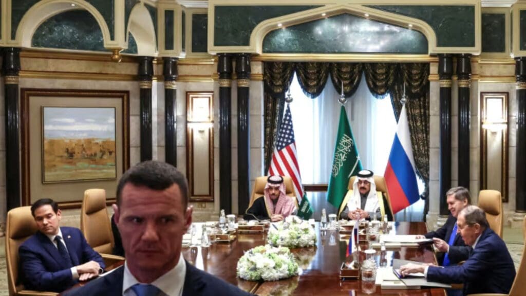 El Secretario de Estado Marco Rubio, izquierda, se reúne con funcionarios en el Palacio Diriyah, en Riad, Arabia Saudí, el martes. FOTO: EVELYN HOCKSTEIN/REUTERS