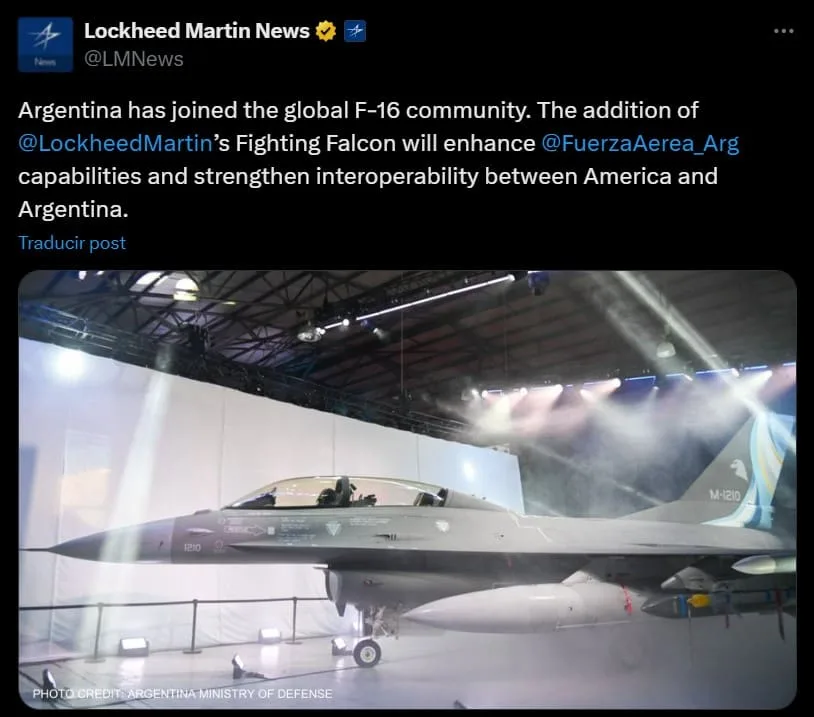 El pasado lunes, el Ministerio de Defensa y la Fuerza Aérea Argentina celebraron la presentación del primer F-16BM Fighting Falcon adquirido a Dinamarca. Denominado oficialmente como “número 25”, es la primera aeronave del programa destinada a tareas de formación y entrenamiento de pilotos, tripulaciones, mecánicos y técnicos con el nuevo sistema de armas. Con motivo de ese hito desde la empresa estadounidense Lockheed Martin ha dado la bienvenida a la Argentina como nuevo operador del avión de combate, sumándose a un importante número de países, a través de sus redes sociales.