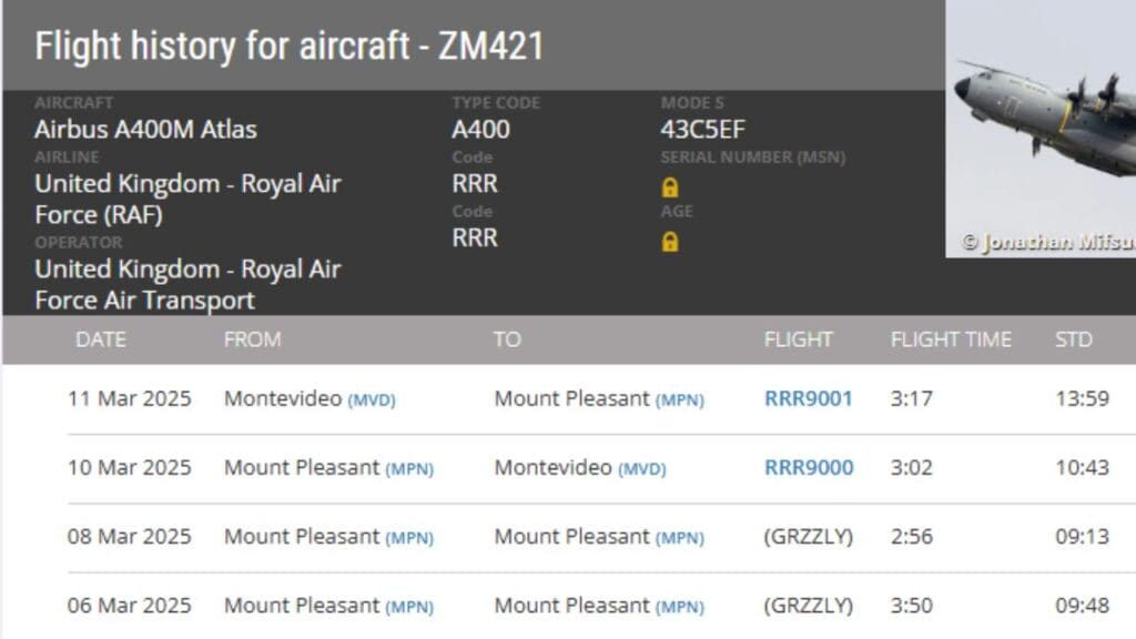 Un avión Airbus A400M Atlas de la Real Fuerza Aérea Británica (RAF) partió hacia las Islas Malvinas luego de realizar una escala en Montevideo, Uruguay, como parte de una serie de misiones de reconocimiento en el Atlántico Sur y la Antártida. La aeronave, identificada como ZM421, opera bajo el control de las Fuerzas Británicas de las Islas del Atlántico Sur (BFSAI, por sus siglas en inglés) y ha reforzado la presencia ilegal militar británica en la región.