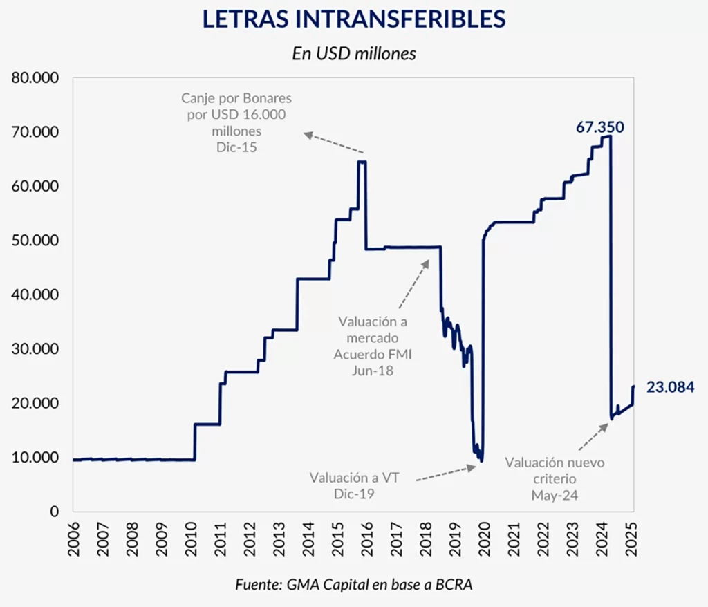 Uno de los puntos clave de esta operación es la recompra de deuda del Tesoro en poder del BCRA, específicamente las Letras Intransferibles, emitidas desde 2006 como un mecanismo de financiamiento en el cual el Tesoro entregaba títulos al Banco Central a cambio de dólares de las reservas.