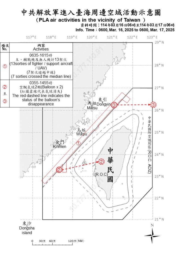 Por su parte, China ha intensificado su presión militar alrededor de Taiwán. Según el Ministerio de Defensa Nacional taiwanés, entre el 16 y el 17 de marzo, se detectaron 13 aeronaves militares y 9 buques de la Armada del Ejército Popular de Liberación operando en las cercanías de la isla. Siete de estas aeronaves cruzaron la línea media del Estrecho de Taiwán, una acción que representa una violación de facto del statu quo en la región. Además, se informó la presencia de dos globos chinos en el espacio aéreo taiwanés.