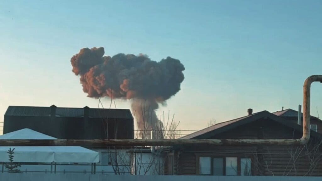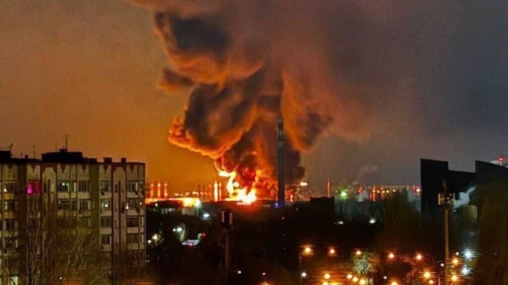 Un enorme incendio se eleva desde un depósito de petróleo en Engels, Rusia, después de un ataque de drones ucranianos. Créditos: A Kamyshin/X