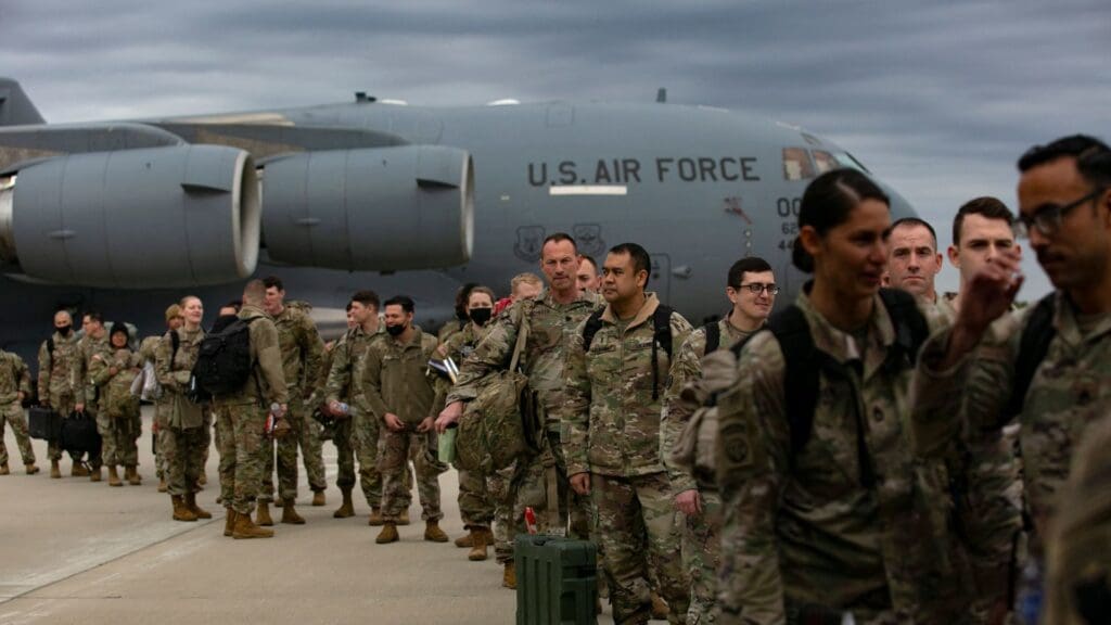 Las tropas estadounidenses se despliegan hacia Europa desde el aeródromo Pope Army en Fort Bragg, Carolina del Norte, en 2022. Créditos: Allison Joyce/AFP vía Getty Images