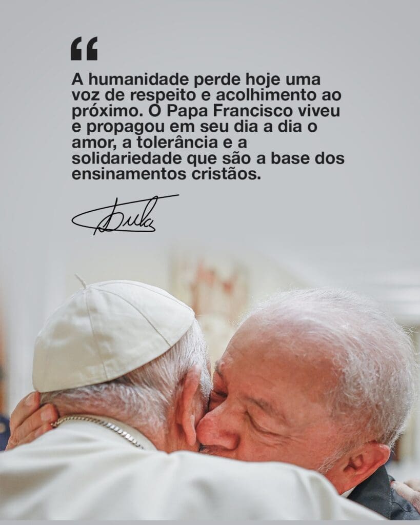 Por su parte, el presidente de Brasil, Luiz Inácio Lula da Silva, manifestó: “Hoy en día, la humanidad pierde la voz del respeto y la aceptación hacia los demás. El Papa Francisco vivió y propagó en su vida cotidiana el amor, la tolerancia y la solidaridad que son la base de las enseñanzas cristianas. Tal como lo enseña la oración de San Francisco de Asís, el argentino Jorge Bergoglio buscó incansablemente llevar amor donde había odio. Unión donde había discordia. Y la comprensión de que todos somos iguales, viviendo en la misma casa, nuestro planeta, que necesita urgentemente nuestro cuidado”. Además, decretó siete días de luto en Brasil.