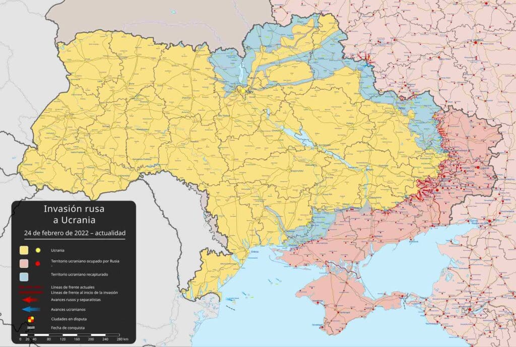 Territorios ocupados por Rusia (en rojo) en Ucrania a día de hoy. Fuente: ISW.