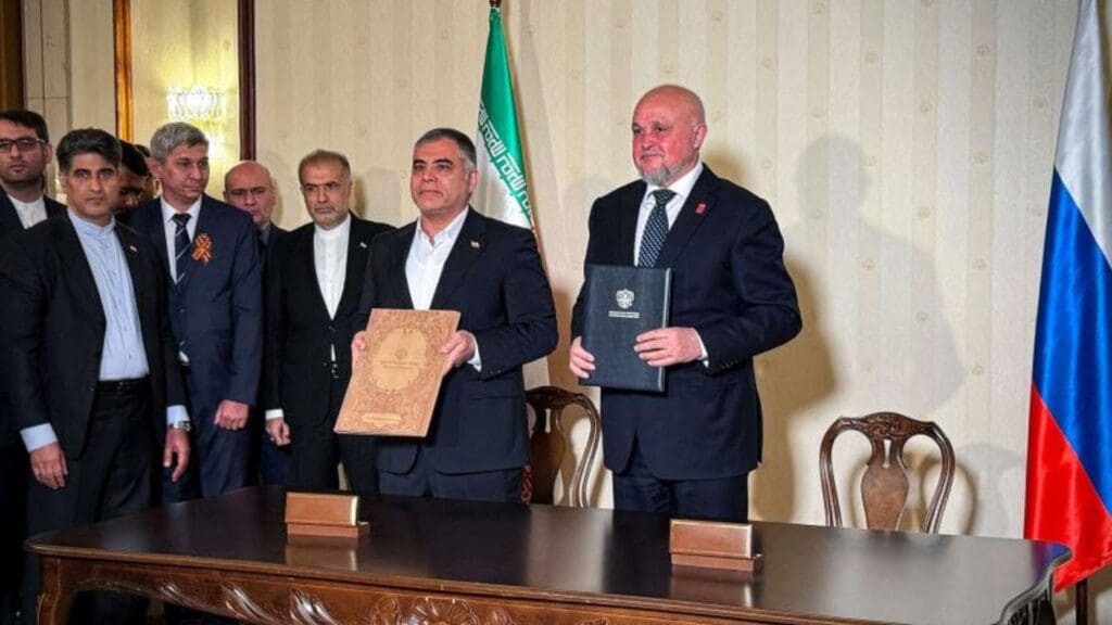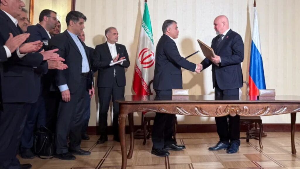 El ministro ruso de Energía, Sergei Tsivilev, y el ministro iraní de Petróleo, Mohsen Paknejad, posan durante una ceremonia de firma en Moscú el 25 de abril de 2025. Créditos: REUTERS