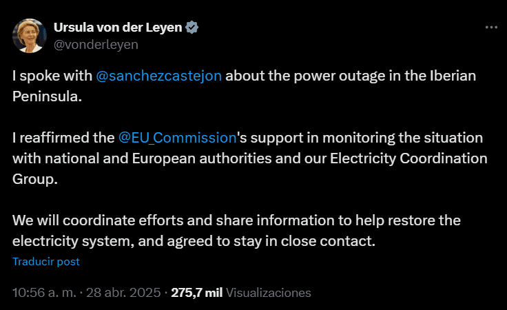 Tras el masivo apagón que afectó a España y Portugal, la presidenta de la Comisión Europea, Ursula von der Leyen, expresó su respaldo al presidente Pedro Sánchez y confirmó el apoyo de Bruselas en las tareas de recuperación del suministro eléctrico.