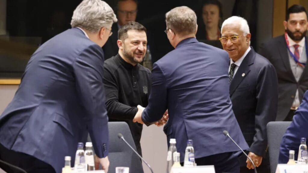 El Presidente ucraniano, Volodymyr Zelenskyy, estrecha la mano de los líderes europeos junto al Presidente del Consejo Europeo, António Costa (derecha), antes de una reunión para debatir el apoyo continuado a Ucrania y la defensa europea, en la sede de la Unión Europea en Bruselas, el jueves. Créditos: Ludovic Marin/AFP vía Getty Images