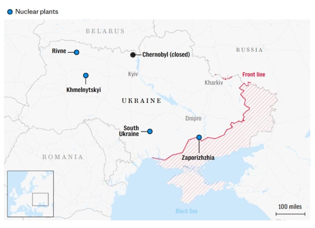 De estas estadísticas, Ucrania se destaca, ya que posee cuatro centrales nucleares con un total de 15 reactores en funcionamiento, además de las reservas adyacentes de barras de combustible usadas y otros residuos radiactivos. Dos centrales se encuentran en el oeste -Jmelnytskyi y Rivne-, mientras que la tercera está en el sur, al norte de Odesa y más cerca de las líneas del frente. Zaporizhia es la más oriental, aunque se pausó su funcionamiento luego de que Rusia tomara el control de la misma.