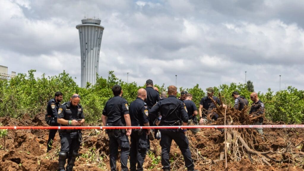 Fuerzas de seguridad israelíes en el lugar donde un misil disparado desde Yemen impactó en una zona del aeropuerto Ben Gurion, el 4 de mayo de 2025. (Chaim Goldberg/Flash90)