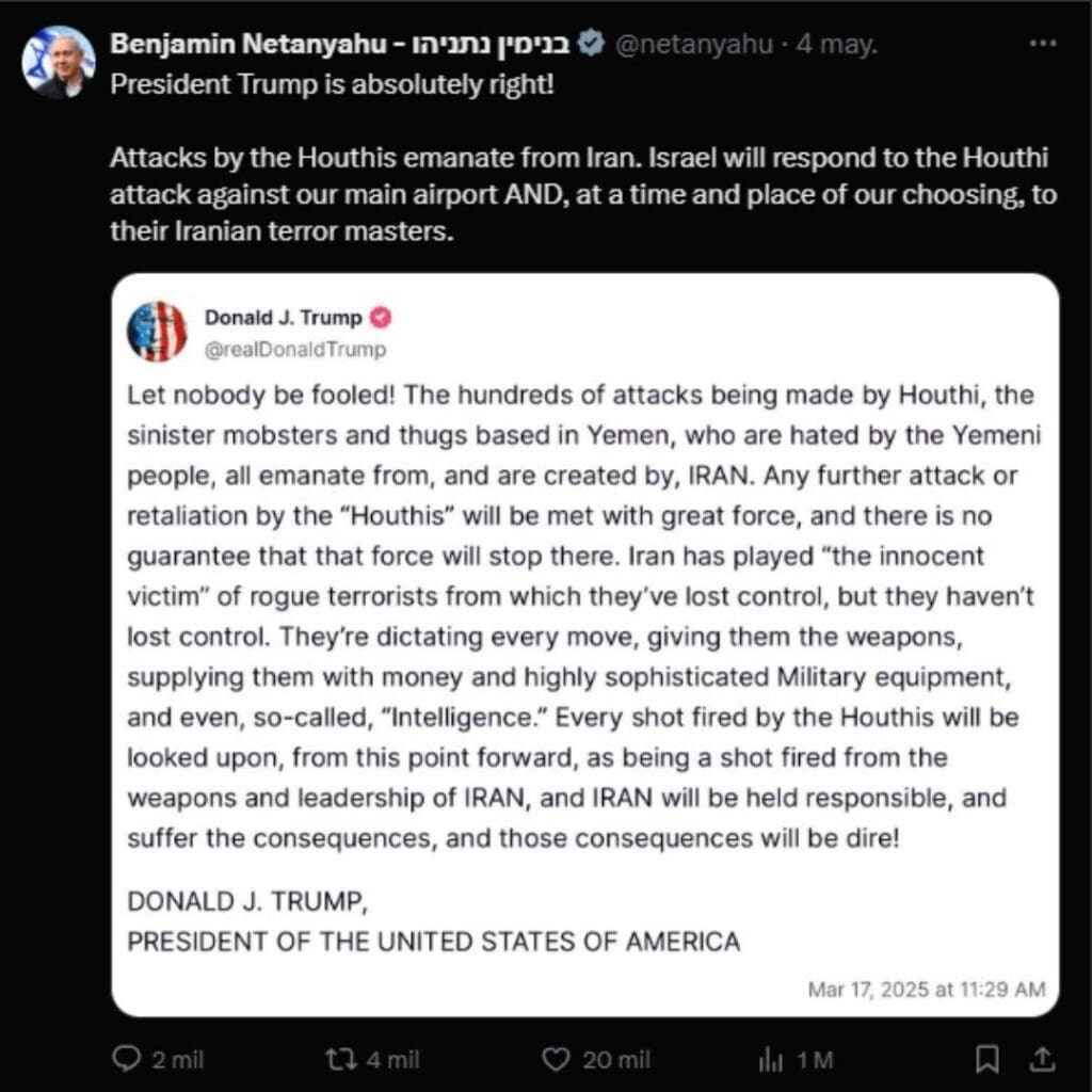 En este contexto, Netanyahu declaró en redes sociales que “los taques de los hutíes emanan de Irán”. “(El presidente de EEUU, Donald) Trump tiene toda la razón. Israel responderá al ataque Houthi contra nuestro principal aeropuerto Y, en el momento y lugar que elijamos, a sus amos terroristas iraníes”, subrayó en X. Además, compartió un post de Trump del 17 de marzo en el que el mandatario apuntaba contra los hutíes por atacar a Israel en defensa de Hamás.
