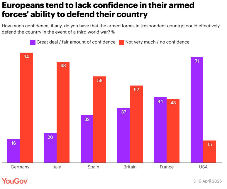 El estudio en cuestión recaudó interesantes datos con respecto a la apreciación de los encuestados sobre sus fuerzas armadas. Solo una minoría de los ciudadanos de Europa Occidental cree que sus fuerzas armadas nacionales podrían defender eficazmente a sus países en caso de una tercera guerra mundial. Este nivel de confianza varía desde un mínimo del 16 % en Italia hasta un máximo del 44 % en Francia. En contraste, el 71 % de los estadounidenses confía en que sus fuerzas armadas serían capaces de proteger al país.