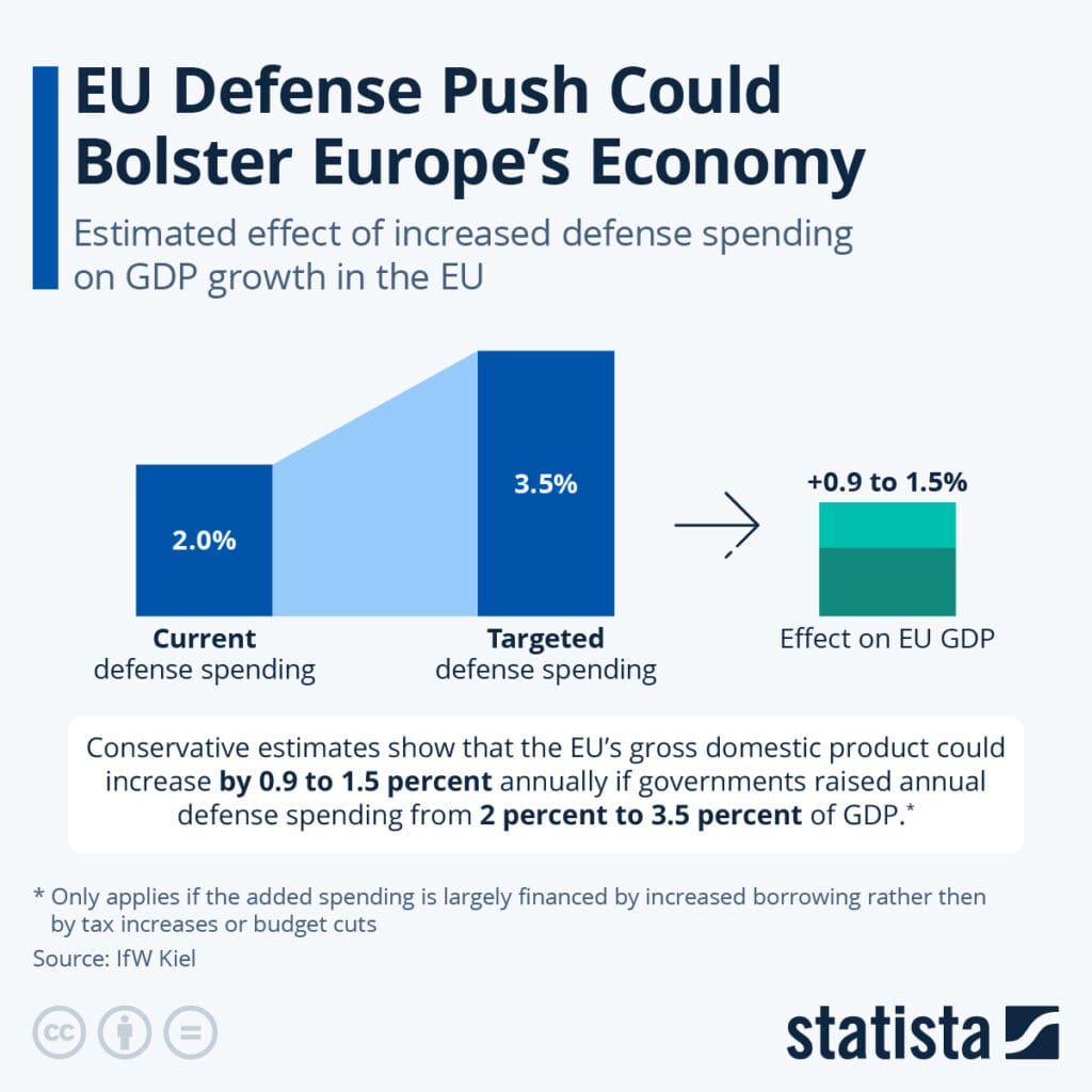 A este respecto, Moritz Schularick, presidente del Instituto de Economía Mundial de Kiel, estima que elevar el gasto en defensa desde poco menos del 2% al 3,5% del PBI representaría un costo anual cercano a los 300.000 millones de euros. No obstante, si se invierte de manera eficiente, esta suma podría traducirse en un incremento económico de magnitud similar. Ese aumento del gasto podría impulsar el crecimiento del PBI entre un 0,9% y un 1,5%, lo que sería especialmente positivo considerando que el crecimiento agregado del bloque fue de apenas 0,9% en 2024.