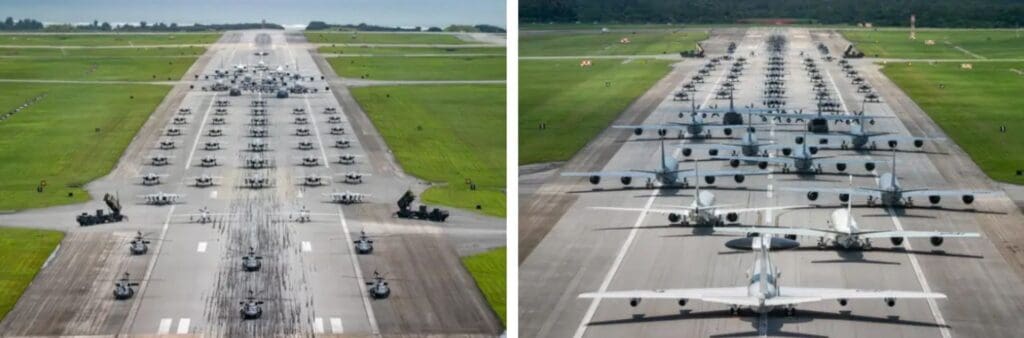 Los “paseos de elefantes” suelen contar con un gran número de aeronaves, y la de la Base Aérea de Kadena contó con 53 aviones de las Fuerzas Aéreas y de la Armada, así como dos baterías de defensa antiaérea Patriot del Ejército. Se considera la mayor jamás celebrada en Japón, casi el doble de la exhibición de 33 aviones del año pasado en la base, que contó con F-22 Raptors y F-16 Fighting Falcons.