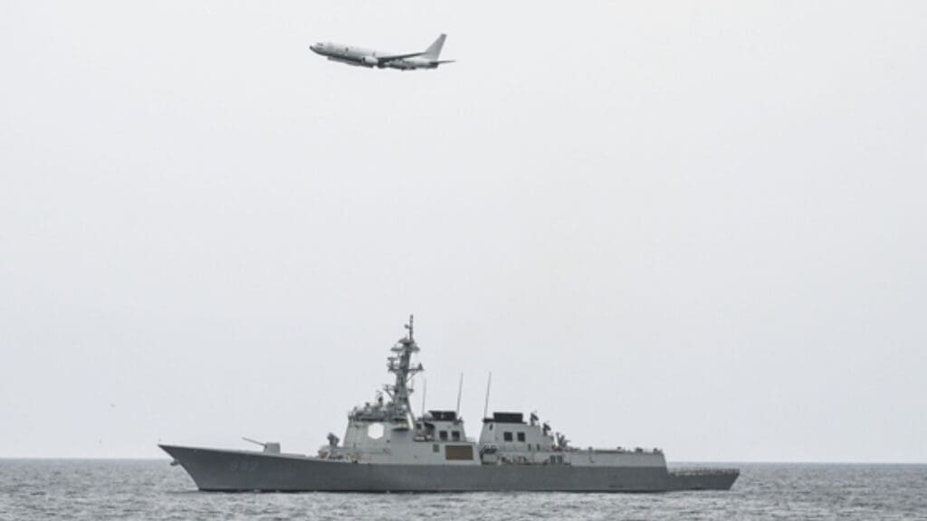 El ROKS Yulgok Yi I y un avión de patrulla marítima P-8 de la Marina estadounidense realizan un ejercicio combinado de la Fuerza Marítima de Operaciones Contraespeciales (MCSOF) en el Mar del Este el 11 de mayo. Créditos: YONHAP