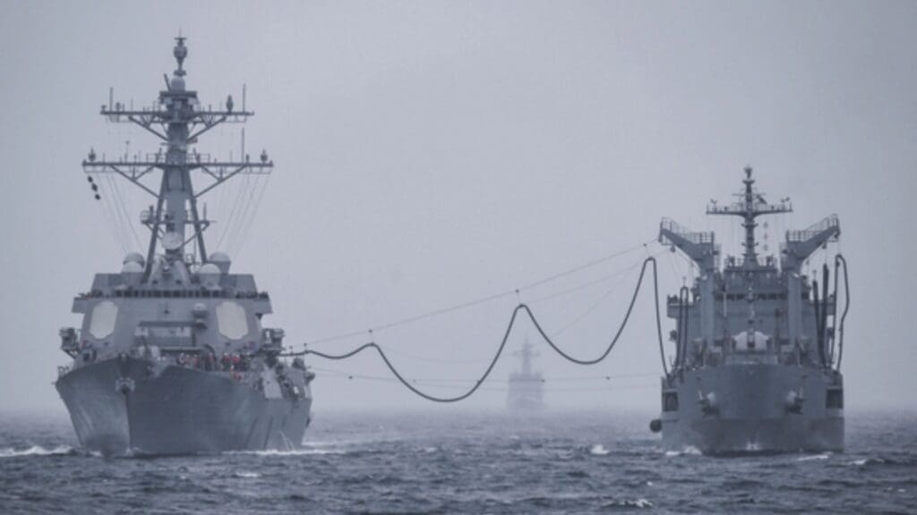 El USS William P. Lawrence, a la izquierda, y el ROKS Daecheong realizan un ejercicio de reabastecimiento en el Mar del Este el 9 de mayo. Créditos: NEWS1