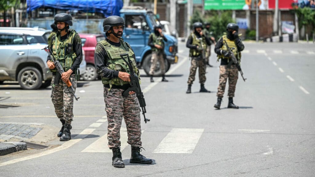 Soldados paramilitares hindúes vigilan una calle en Srinagar, Cachemira, el 11 de mayo de 2025. Créditos: Sajjad Hussain/AFP