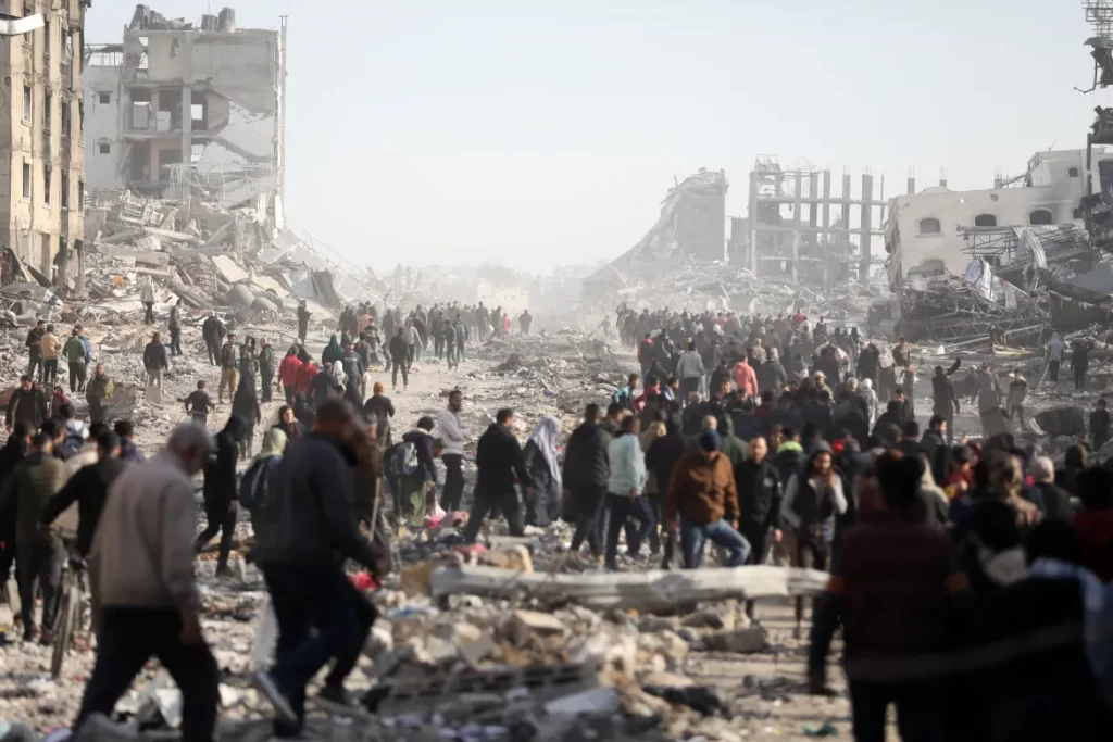 Palestinos desplazados caminan entre los escombros mientras intentan regresar a sus hogares en el norte de Gaza. Créditos: Dawoud Abu Alkas/Reuters