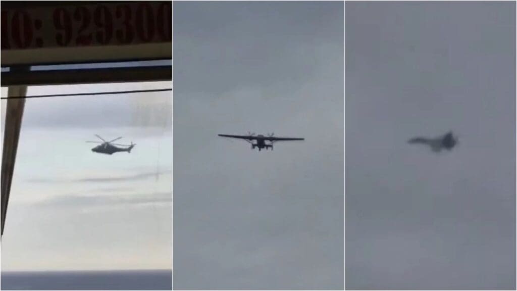 Un helicóptero estonio AgustaWestland AW139, un avión M28 Skytruck y un caza ruso Su-35 sobre el buque JAGUAR. 14 de mayo de 2025. Golfo de Finlandia. Créditos de las fotos: Medios de comunicación rusos