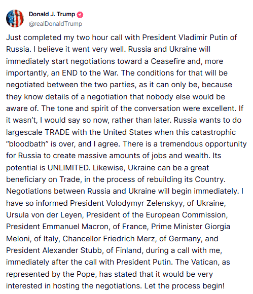 El presidente de Estados Unidos, Donald Trump, anunció que Rusia y Ucrania iniciarán negociaciones orientadas a alcanzar un alto el fuego, tras una conversación telefónica de más de dos horas con su homólogo ruso, Vladímir Putin.